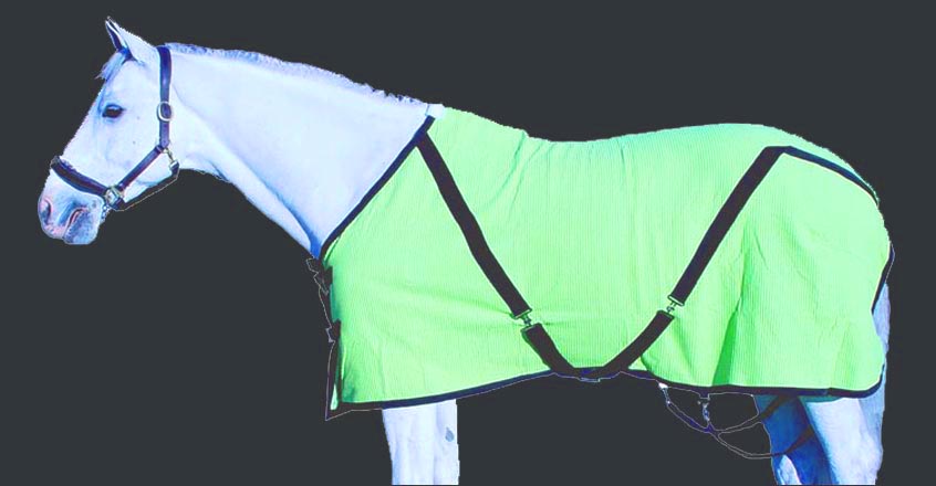110 - Cotton Waffle Sheet, Tropical colors available! This highly breathable sheet is made with 100% heavy cotton in a special waffle woven design. Can be used as an anti-sweat sheet or show sheet. Check out our new tropical colors! Criss-cross bias surcingles, double front closures, adjustable elastic leg straps, nylon lining at the shoulders with fleece to protect the withers, reinforced with polypropylene, and nylon-lined shoulder panels to prevent hair loss. Pre-shrunk, expect shrinkage of approx 5%. Sizes: 66"-86". Machine washable.