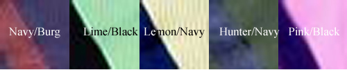 Hunter/Navy, Hunter/Burgundy, Navy/Hunter, Navy/Burgundy, Pink/Black, Lemon/Navy, Lime/Black